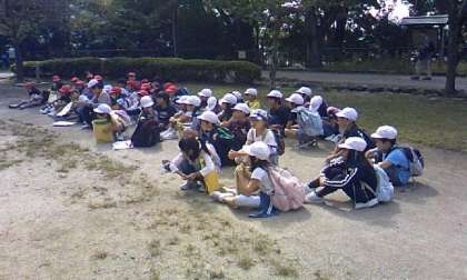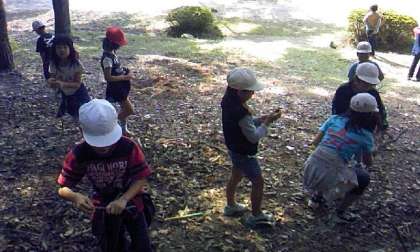 疏水公園に到着。お弁当までどんぐり拾いをします。