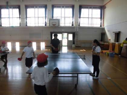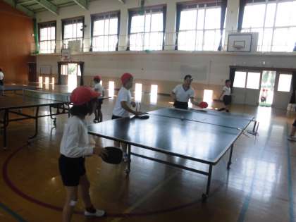 卓球クラブの様子です。今日はサーブの練習をメインに励んでいます。できる子が練習中の子に熱心に教えている姿がたくさん見られました。