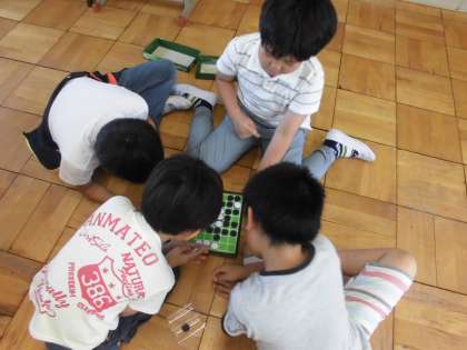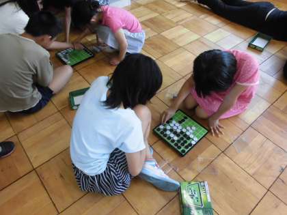 昔遊びクラブの様子です。今日はオセロゲームをトーナメント式で戦いました。強い人をよく見て,なぜ強いのか秘密を探る子どももいれば,よ〜く考えて慎重におく子ども,直感でおく子ども…そばで見ているとおもしろいです。