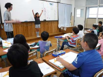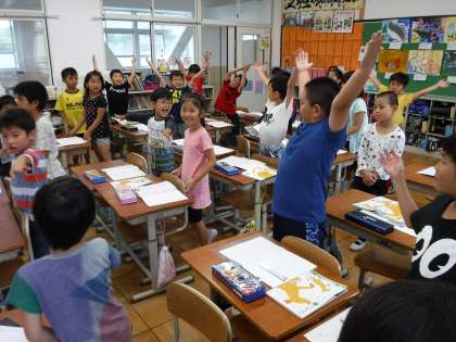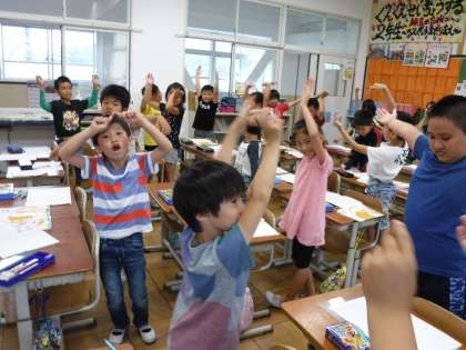 スイミーの学習♪今日は文章の構成を考えました。また,スイミーに出てくるクラゲやイソギンチャクを想像して真似している様子です。