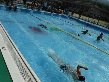 5年生今年度初めての水泳学習です。天気も気温も水温もばっちりです。5年生も練習した後に記録を測りました。