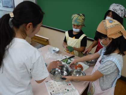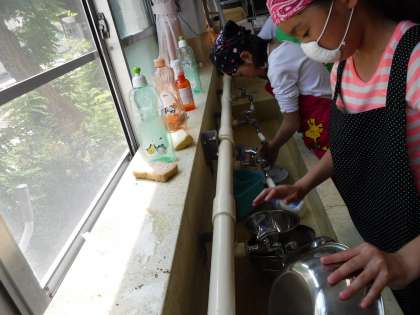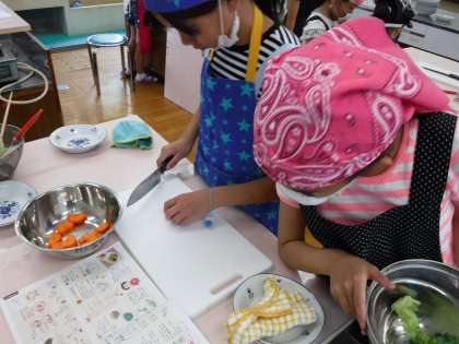 今日は2組のはじめての調理実習です。作るものは1組と同様カラフルコンビネーションサラダです。使う器具を洗って,野菜を切ります。