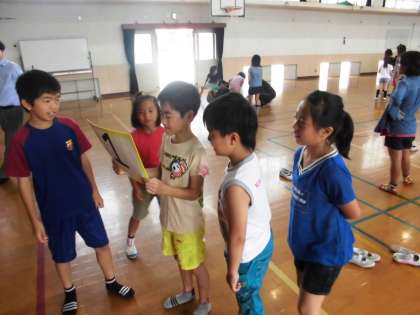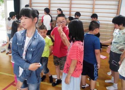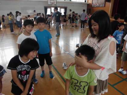 たてわり委員会が考えてくれたゲームでグループ毎に楽しみました。鬼になった人をグループの誰かが後ろからタッチします。鬼はタッチした人を当てるというルールでした。それぞれのグループで工夫しながら楽しむ様子が見られました。そろそろ1年生もみんなの名前が覚えられたかな?
