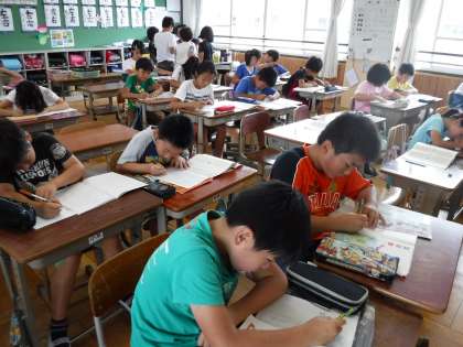 夏休みに行くなら海か山どちらかというテーマで意見文を書きました。子どもたちは「初め,中,終わり」で文を構成しました。
