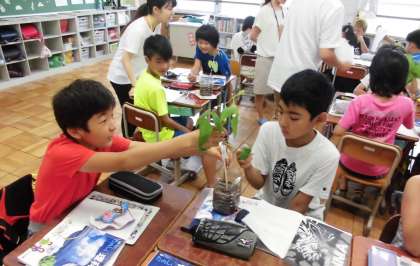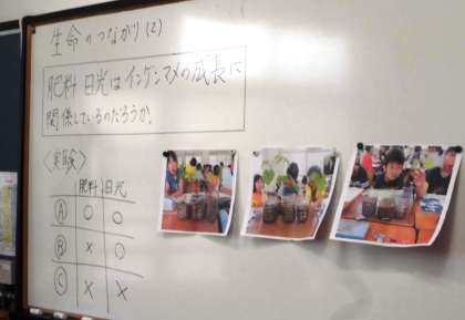 インゲンマメの成長に肥料や日光は必要かどうか考えます。どのくらい成長しているか班で調べています。