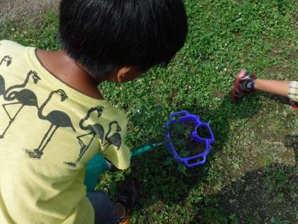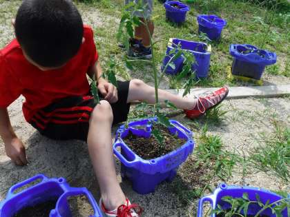 小さなポットで育て、立派な苗になったミニトマトをいよいよ植え替えます。立派に植え替えができました!ミニトマト、実るといいな〜♪