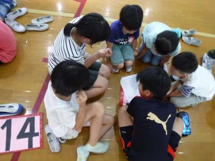 たてわりで集まり、スマイル遊びの内容をみんなで決めました。おにごっこ、遊具遊び、ペットボトルボーリングなどいろんな遊びが決まりました。わくわくしますね。