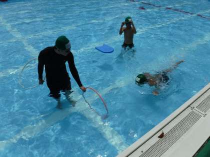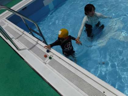 今日は1年生と4年生がペアになり小石拾いを、6年生はビート版でバタ足の練習をしました。