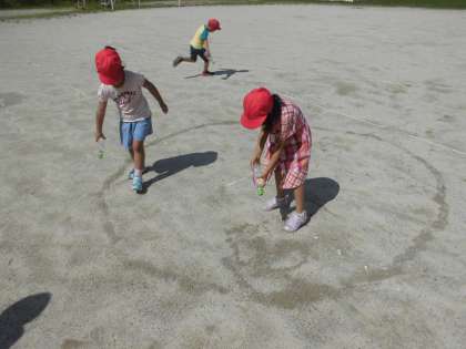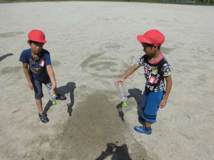 生活科では,夏を楽しむ体験をしました。ペットボトルの水を飛ばしたり,水で地面に絵を描いたりしました。一生けん命描いても,すぐに乾いてしまうくらい暑かったですね。夏をしっかり楽しんでいました。