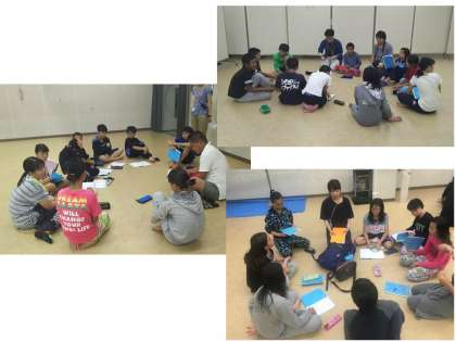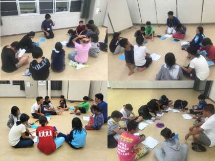 リーダーは校長先生のところに、保健係は太田先生のところに、レクリエーション係は吉岡先生のところに、食事係は山田先生のところに集まって、今日の振り返りをしています。