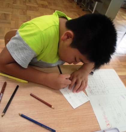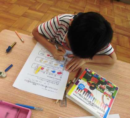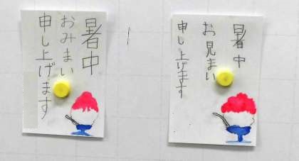 暑中見舞いのはがきを書きました。かき氷がおいしそうに描けました。食に関する指導のふりかえりもしました。