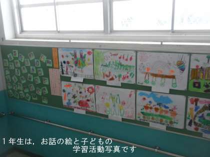1年生の階段掲示板には,お話の絵と工作ではこを使って取り組んだときの一人一人の子どもたちの写真を掲示しました。