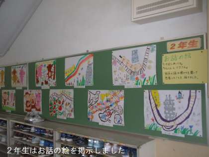 2年生は,靴箱上の掲示板に「お話の絵」を貼りました。