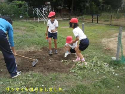 夏からみんなで育てていた「さつまいも」を今日収穫しました。一人一人スコップをもって慎重に掘っていきました。