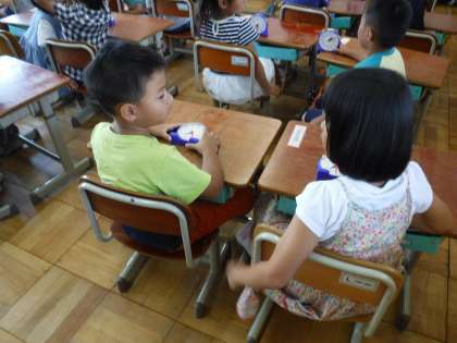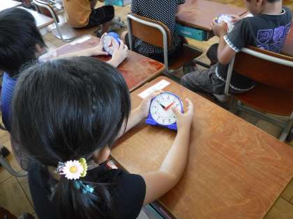 1年生は時計の学習が始まりました。今日は時計をよもうのめあてで、一人ひとつ小さい時計をもち操作しながらの学習でした。30分とも読めますが、「はん」という読み方もあること、短い針と長い針のしくみなどたくさん知りました。