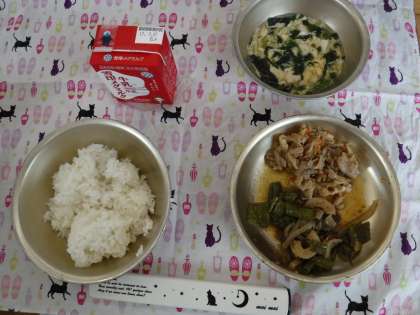 今日の献立は「豚肉のしょうがいため」「伏見とうがらしのおかか煮」「かきたま汁」「牛乳」でした。