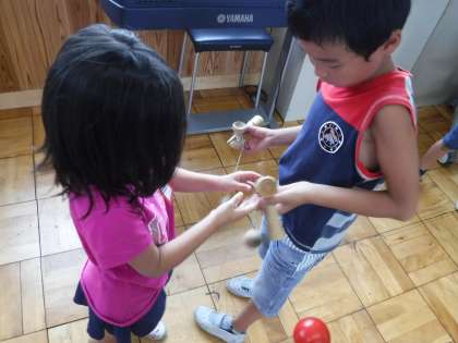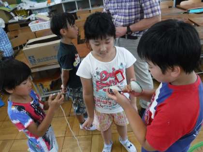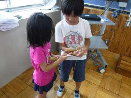 おばけやしきを待っている間は、2年生のコマ名人とけん玉名人にコツを教えてもらいながら遊びました。やさしく教える姿がありました。