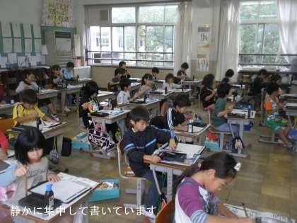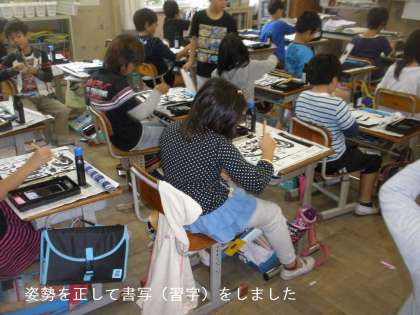 2校時に1組も2組も習字をしました。「つり」という字を練習しました。習字(毛筆)は漢字よりひらがなの方が難しいです。どちらのクラスも静かに集中して取り組んでいました。