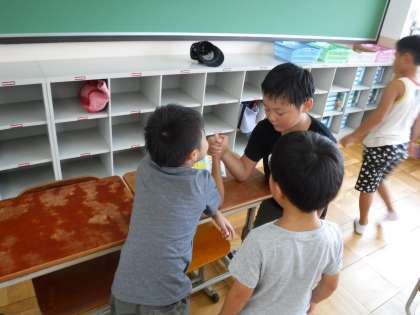 1年生の学習会が午前中に行われました。久しぶりに元気な子どもたちと会うことができました。宿題をしたり,読書プリントの書き方を教えてもらったり,一人ひとり自分の課題に集中して取り組んでいました。休憩のときには腕相撲対決をする子どもの姿もありました♪1年生は明日登校日ですね。