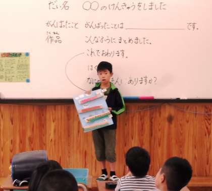 夏休みにそれぞれががんばった自由研究の発表をしました。それぞれ工夫したことをしっかり発表できました。聞いているみんなも,興味を持っていろいろな質問をしていました。ぜひ,13日からの作品展で子どもたちのがんばりをご覧ください。