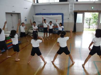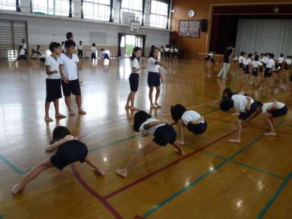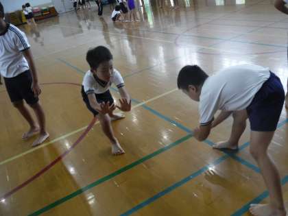 グループに分かれて4年生が3年生に、ポイントをやさしく教えています。