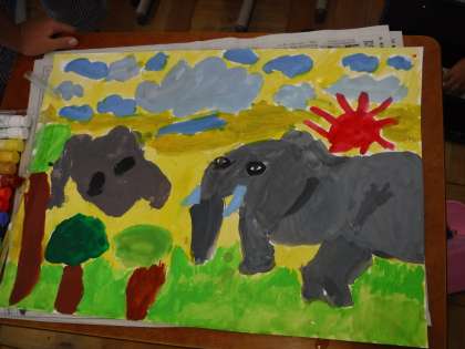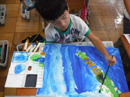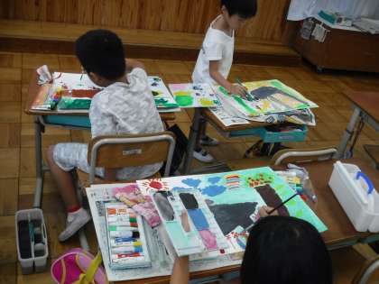 図画工作の時間にお話を聞いて、イメージした場面を絵に表現しました。