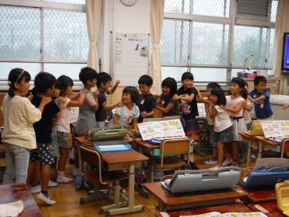1年生は音楽の学習で、けんばんハーモニカを練習しています。