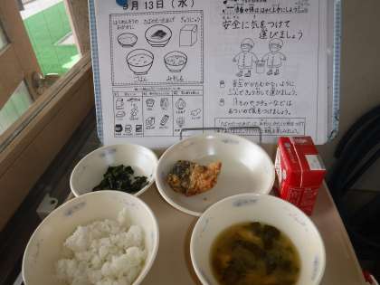 今日の献立は、「ほうれん草のおかかに」「さばの竜田揚げ」「ごはん」「みそしる」です。