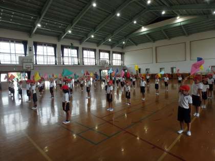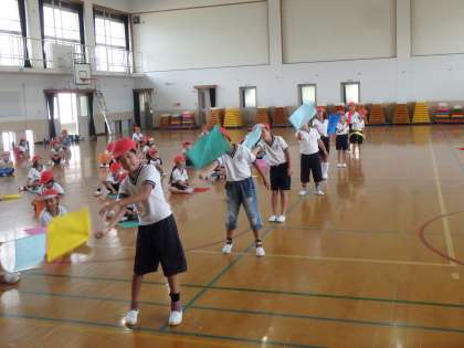 今日の運動会の練習は、旗を使ってダンスをしました。だんだんと完成に近づいてきています。
