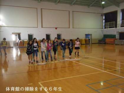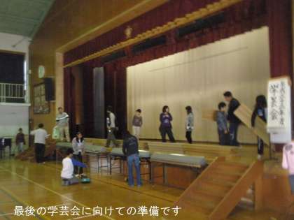 5校時,6年生の力を借りて体育館の清掃,準備が始まりました。6年生にとっては最後の学芸会になりますので,気持ちをこめてがんばってくれています。放課後に教職員の手で舞台装置等を点検準備して,明日の本番をむかえたいと思います。