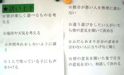 誘った時に,「いいよ。遊ぼう!」と言われるとうれしいけれど,「無理。」と冷たく言われると嫌な気持ちになる,という話題から,誘われる立場になって考えました。“笑顔”で明るく答えることや,遊びたい内容が相手と違った時に,“別の遊びを提案する”ということも考えました。