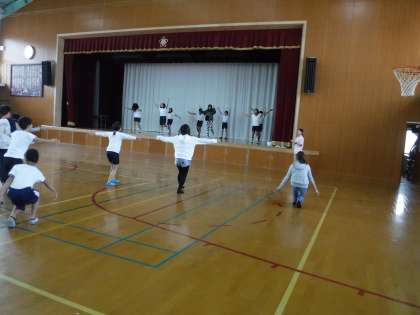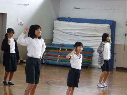 今日の中間休みは、高学年の準備体操(全校ダンス)の練習日でした。