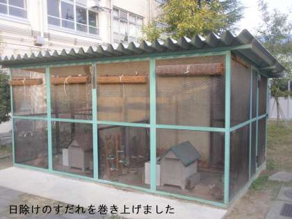 夏の間,日よけにしていた「すだれ」を巻き上げました。これからの季節少しでも日光が小屋の中に差し込むようにしなくてはなりません。また,来週には透明のビニールシートをはり,風除けをします。