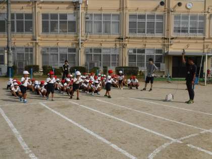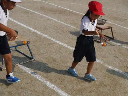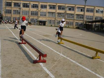 今日は、障害物競走(「跳んで運んで、栄光の架け橋を〜渡った後にはスマイルを〜」)の練習をしました。名前のとおり、慎重に運んだり、平均台を渡ったりしながら競います。