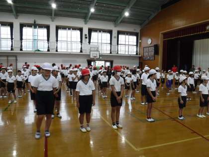 雨天のため体育館で、開会式と閉会式の練習を行いました。