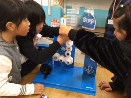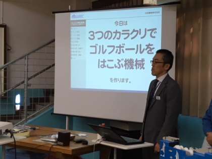 からくりについて学び、ゴルフボールをうまく運ぶために、壊れた場所を探して直します!うまく直せるかな?