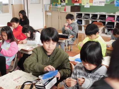 チャコペンで書いた自分の名前を,糸で縫いつけることにチャレンジ! 針に糸を通し終えて,思わず「ふー。」と出てしまう声。思ったところに針を刺そうと指で調整する作業。集中力のいる時間でした。
