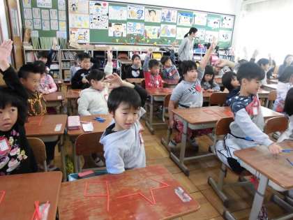 ぼうでいろいろな形作づくりに挑戦!四角をたくさん作ったり,三角の花びらを作ってお花にしたり,思い思いの形作りをしました。形作りの後には「形の変身クイズ」。「9を一本動かして6にできるかな?」「かんたんかんた〜ん!」。こういう問題は,大人より子どもの方が得意かもしれません。自信満々で手を挙げる子がいっぱいでした。