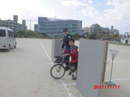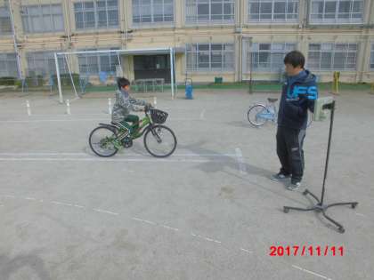 本日,自転車安全教室を開催しました。1年生〜3年生の児童が,山科警察署交通課の警察官の方々に交通安全に関するルールや自転車の乗り方を教えていただきました。