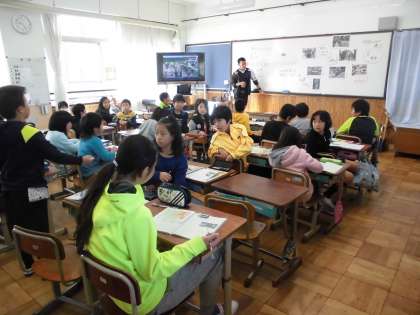 琵琶湖疏水についてのたくさんの写真を見て,「どうして疏水を作ったの?」という何気ない疑問や自分の気づいたこと,考えたことを発表し,子どもたち同士で積極的に話を進めていました。