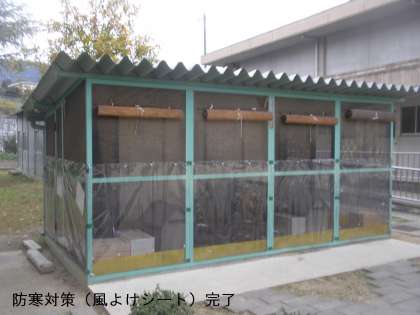 冬に向けて,ウサギ小屋に風よけシートをはりました。ウサギ小屋は校舎と体育館の間にあり,これからの季節,強い寒風が吹きます。ウサギたちも体を寄せ合いじっとしていることが多いです。昨年までは,中の見えないボードをはっていたのですが,今年は透明のビニールシートに変えました。ウサギたちの様子も外から見えます。