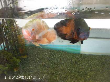 保健室前の大型水槽で飼っている,肉食熱帯魚「オスカー」がさらに大きく成長しています。子どもたちにも慣れて,近づくと「えさ ちょうだい!」と口をパクパクさせてよってきます。