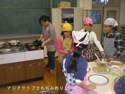 部活動アジアクラブで多文化推進の取組として,韓国の「ちぢみ」作りに挑戦しました。保護者の方をゲストティーチャーに招いて,本格的な「ちぢみ」の作り方を教えてもらいました。できたての熱々ちぢみの味は最高でした。