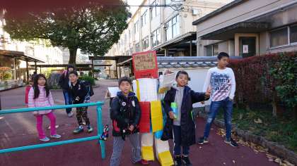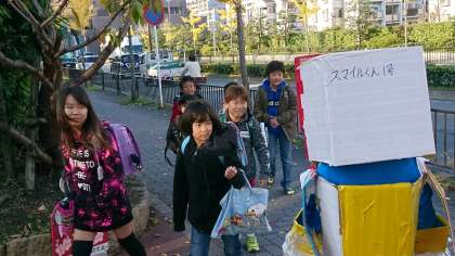 たてわり委員会で,「なか良く,楽しくスマイル給食を!」と登校してくるみんなに呼びかけています。
