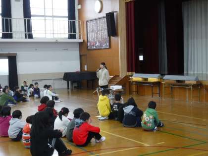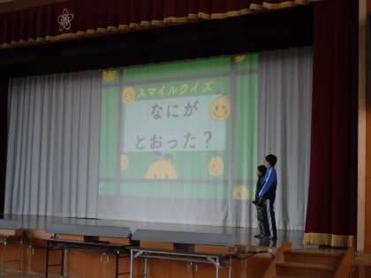 スマイル集会(たてわり活動)で,高宮先生の1分間スピーチとたてわり委員会からスマイルクイズ,次回のスマイル活動のグループでどのような遊びをするか決まました。