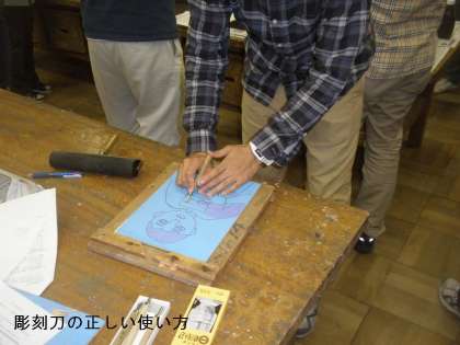 彫刻刀の使い方,彫り方,刷り方など,全教員で一つ一つ復習して指導法を確認し合いました。
