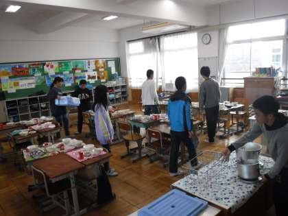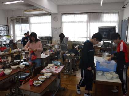 5年生の代わりに給食を取りに行き、1組の分も2組の分も手分けをして配膳をしてくれました。