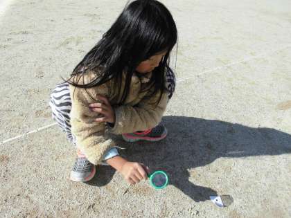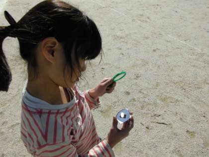 太陽の光を集めたところが,本当にあたたかくなるのか実験しています。