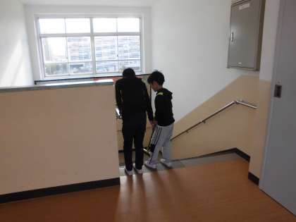 6年生が,1年生に階段の掃除の仕方を教えています。「かどは箒をこう使うとごみがよくとれるよ。」「じょうずじょうず。」と1年生に寄り添って,優しく教えてくれる6年生です。