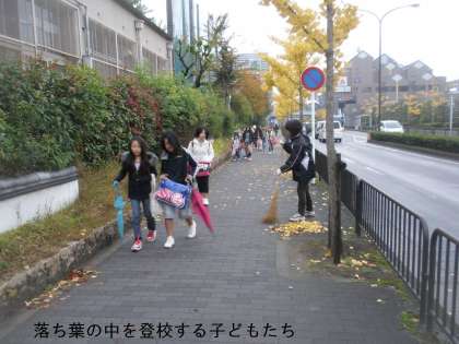 街路樹ですので,学校の木ではないのですが,子どもたちの登下校道ですので放置しておくわけにはいきません。朝から管理用務員さんが掃いて集めています。